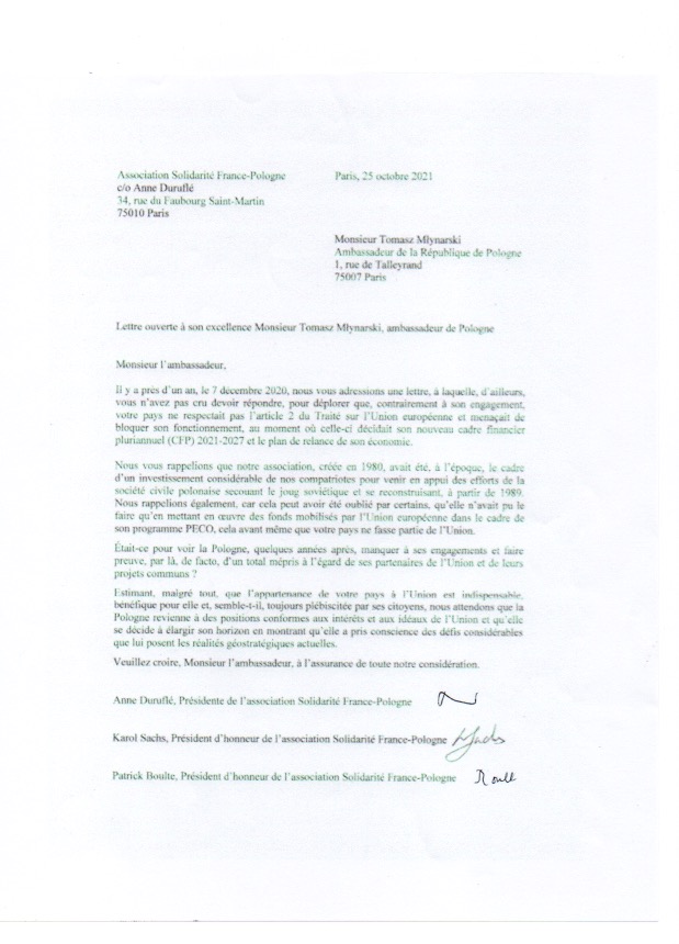 - lettre à l’Ambassadeur de Pologne du 25/10/2021, cliquer ici pour y accéder.